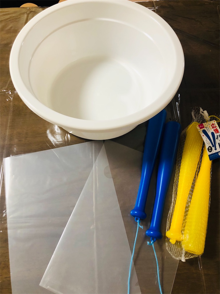 次にタライの上にクリアファイルをのせて短い面の部分をセロテープで仮止めします